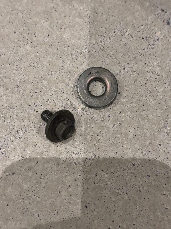 今回は既に割れていたので簡単に外すことができました。本来はチェーンスライダーを固定しているボルトを外した後、スイングアームを外さなければ取れないので時間が掛かります。チェーンスライダーが固定されていたボルトを外します。ボルト位置が奥にあるのでボックスレンチで取り外しが簡単です。ボルトとワッシャがあるので無くさないように保管して作業してください。